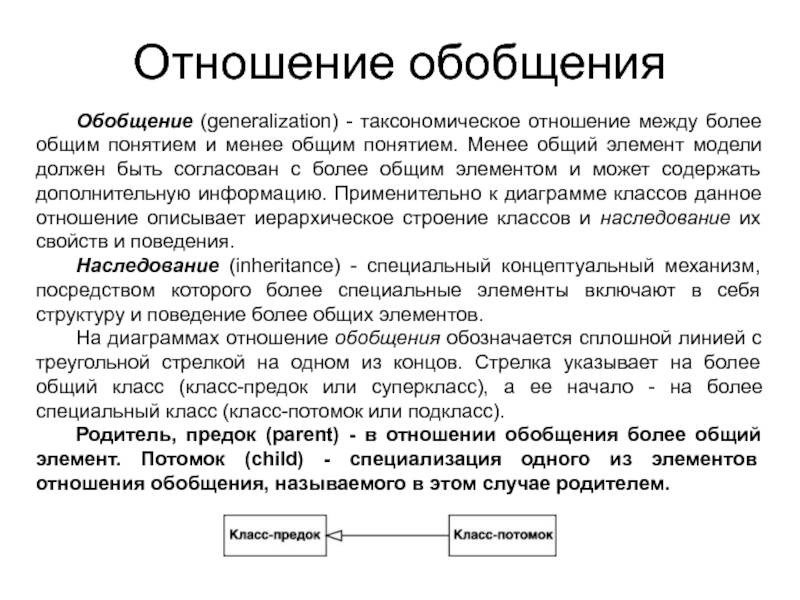 и менее общим понятием. Менее общий элемент модели должен быть согласован с более общим элементом и может содержать дополнительную информацию. Применительно к диаграмме классов данное отношение описывает иерархическое строение классов и наследование их свойств и поведения.