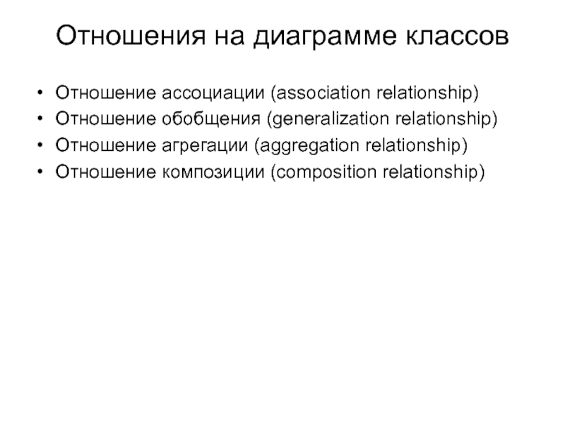 Графически отношение агрегации изображается сплошной линией, один из концов которой представляет собой не закрашенный внутри ромб. Этот ромб указывает на тот класс, который представляет собой "целое" или класс-контейнер. Остальные классы являются его "частями“.