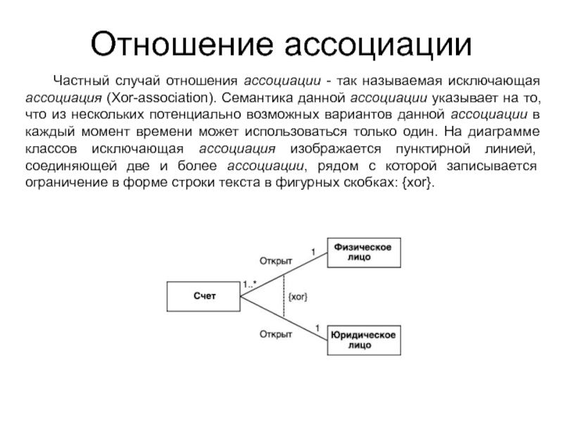 Семантика данной ассоциации указывает на то, что из нескольких потенциально возможных вариантов данной ассоциации в каждый момент времени может использоваться только один. На диаграмме классов исключающая ассоциация изображается пунктирной линией, соединяющей две и более ассоциации, рядом с которой записывается ограничение в форме строки текста в фигурных скобках: {xor}.