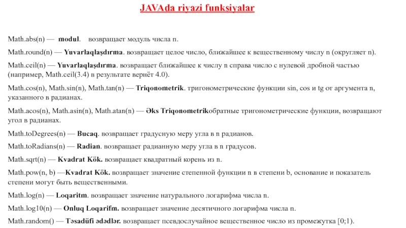 Math.acos(n), Math.asin(n), Math.atan(n) — Əks Triqonometrikобратные тригонометрические функции, возвращают угол в радианах.