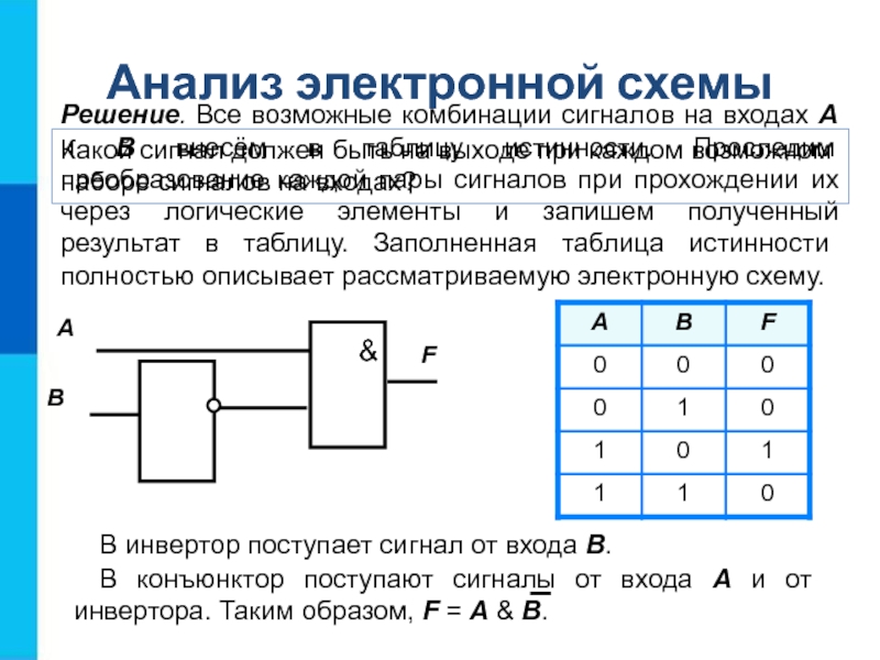 Решение. Все возможные комбинации сигналов на входах А и В внесём в таблицу истинности. Проследим преобразование каждой пары сигналов при прохождении их через логические элементы и запишем полученный результат в таблицу. Заполненная таблица истинности полностью описывает рассматриваемую электронную схему.