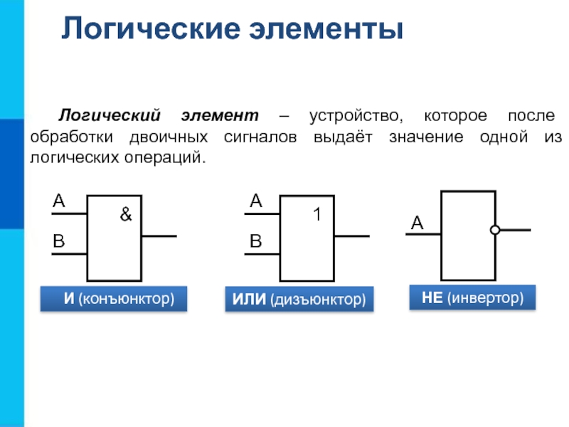 В конъюнктор поступают сигналы от входа А и от инвертора. Таким образом, F = A & B.