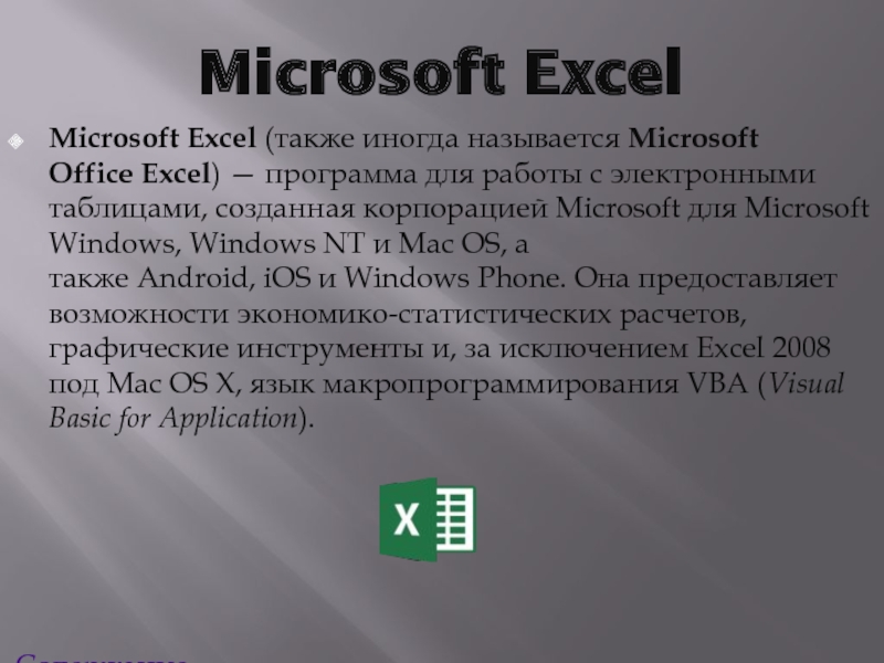Microsoft Excel (также иногда называется Microsoft Office Excel) — программа для работы с электронными таблицами, созданная корпорацией Microsoft для Microsoft