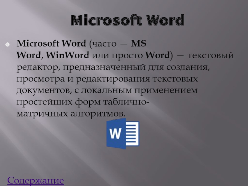 Microsoft Word (часто — MS Word, WinWord или просто Word) — текстовый редактор, предназначенный для создания, просмотра и