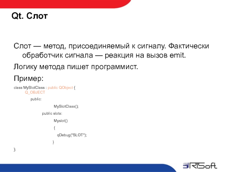 Слот — метод, присоединяемый к сигналу. Фактически обработчик сигнала —