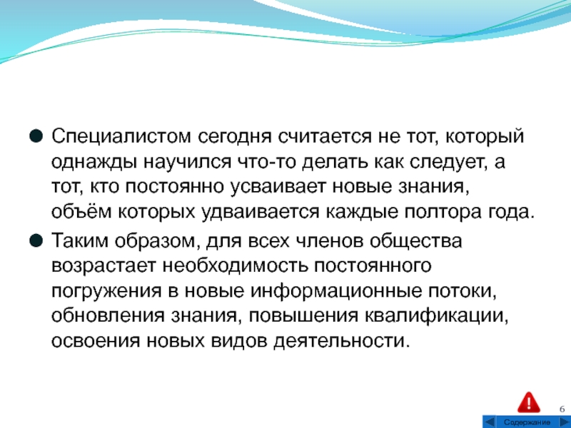 Таким образом, для всех членов общества возрастает необходимость постоянного погружения в новые информационные потоки, обновления знания, повышения квалификации, освоения новых видов деятельности.