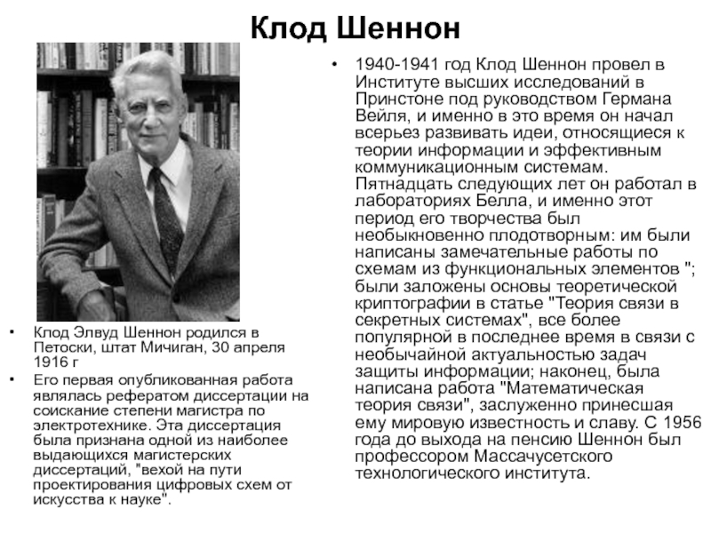 1940-1941 год Клод Шеннон провел в Институте высших исследований в Принстоне под руководством Германа Вейля, и именно в это время он начал всерьез развивать идеи, относящиеся к теории информации и эффективным коммуникационным системам. Пятнадцать следующих лет он работал в лабораториях Белла, и именно этот период его творчества был необыкновенно плодотворным: им были написаны замечательные работы по схемам из функциональных элементов "; были заложены основы теоретической криптографии в статье "Теория связи в секретных системах", все более популярной в последнее время в связи с необычайной актуальностью задач защиты информации; наконец, была написана работа "Математическая теория связи", заслуженно принесшая ему мировую известность и славу. С 1956 года до выхода на пенсию Шеннон был профессором Массачусетского технологического института.