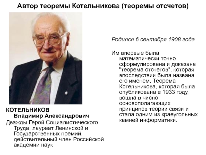 Им впервые была математически точно сформулирована и доказана "теорема отсчетов", которая впоследствии была названа его именем. Теорема Котельникова, которая была опубликована в 1933 году, вошла в число основополагающих принципов теории связи и стала одним из краеугольных камней информатики.