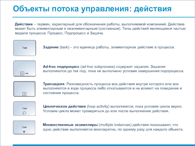 Действие – термин, характерный для обозначения работы, выполняемой компанией. Действие может быть элементарным и неэлементарным (составным). Типы действий являющиеся частью модели процесса: Процесс, Подпроцесс и Задача.