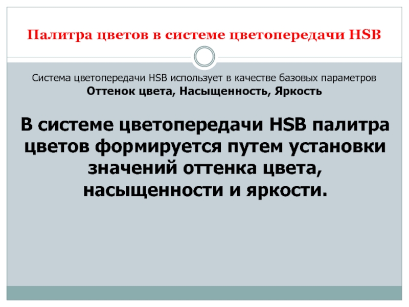 В системе цветопередачи HSB палитра цветов формируется путем установки значений оттенка цвета, насыщенности и яркости.