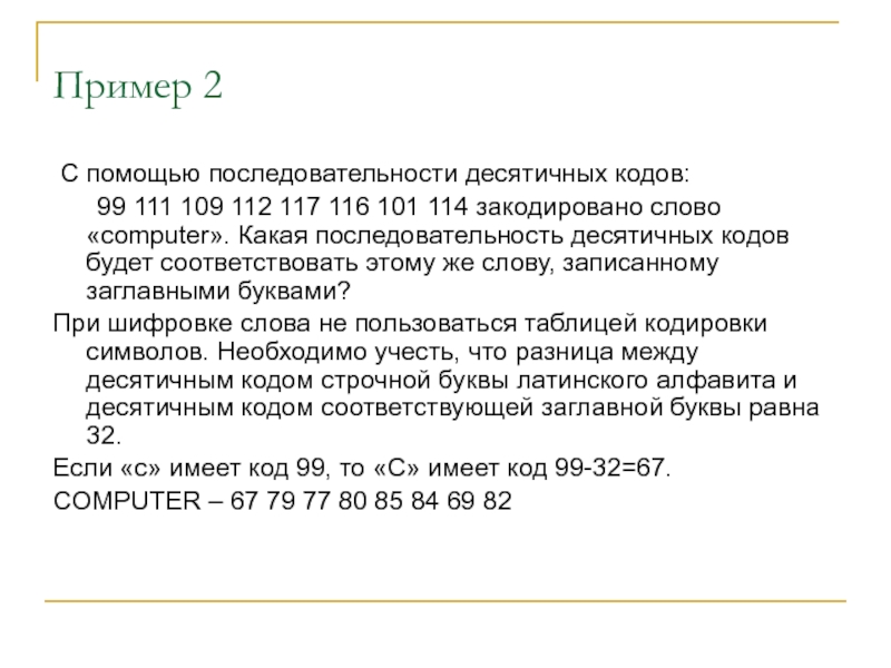 При шифровке слова не пользоваться таблицей кодировки символов. Необходимо учесть, что разница между десятичным кодом строчной буквы латинского алфавита и десятичным кодом соответствующей заглавной буквы равна 32.