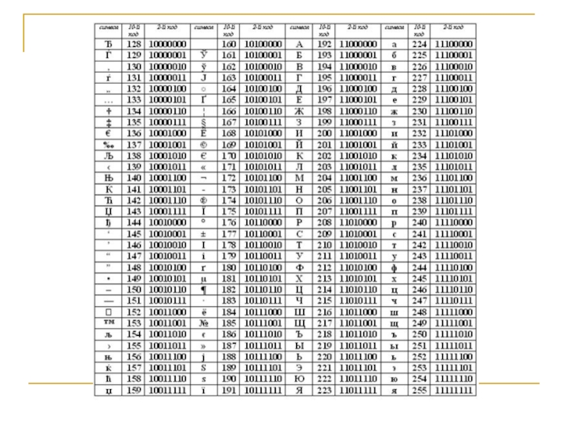 Каждому знаку необходимо поставить в соответствие уникальный двоичный код в интервале от 00000000 до 11111111 (в десятичном коде от 0 до 255)