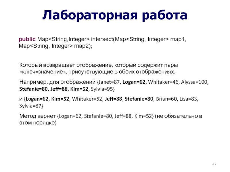 Например, для отображений {Janet=87, Logan=62, Whitaker=46, Alyssa=100, Stefanie=80, Jeff=88, Kim=52, Sylvia=95}