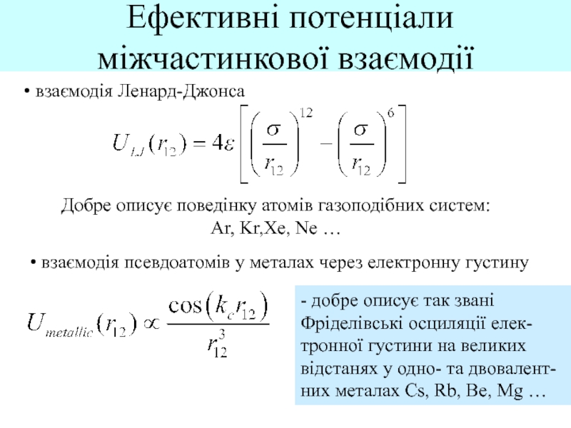 - добре описує так звані Фріделівські осциляції елек-тронної густини на великих відстанях у одно- та двовалент-них металах Cs, Rb, Be, Mg …