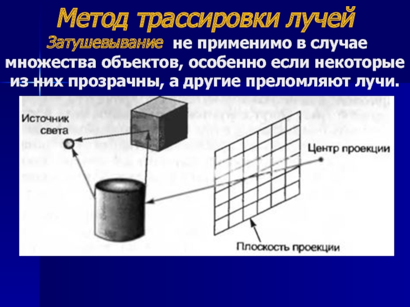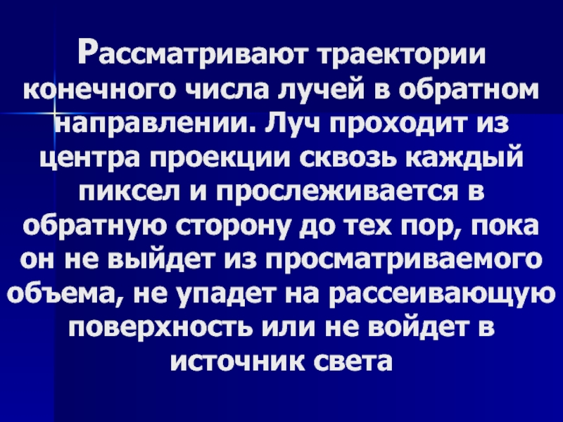 центра проекции сквозь каждый пиксел и прослеживается в обратную сторону до тех пор, пока он не выйдет из просматриваемого объема, не упадет на рассеивающую поверхность или не войдет в источник света