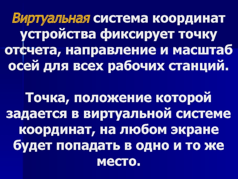 Точка, положение которой задается в виртуальной системе координат, на любом экране будет попадать в одно и то же место.