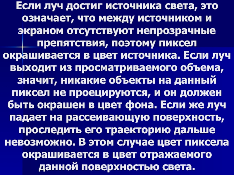 и экраном отсутствуют непрозрачные препятствия, поэтому пиксел окрашивается в цвет источника. Если луч выходит из просматриваемого объема, значит, никакие объекты на данный пиксел не проецируются, и он должен быть окрашен в цвет фона. Если же луч падает на рассеивающую поверхность, проследить его траекторию дальше невозможно. В этом случае цвет пиксела окрашивается в цвет отражаемого данной поверхностью света.