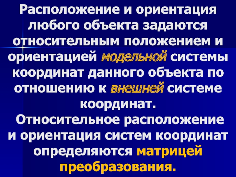 Расположение и ориентация любого объекта задаются относительным положением и ориентацией модельной