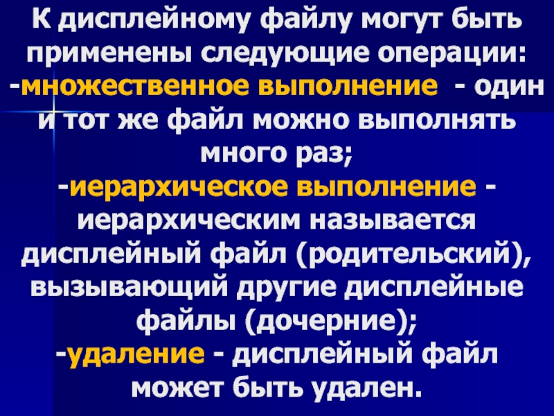 -иерархическое выполнение - иерархическим называется дисплейный файл (родительский), вызывающий другие дисплейные файлы (дочерние);