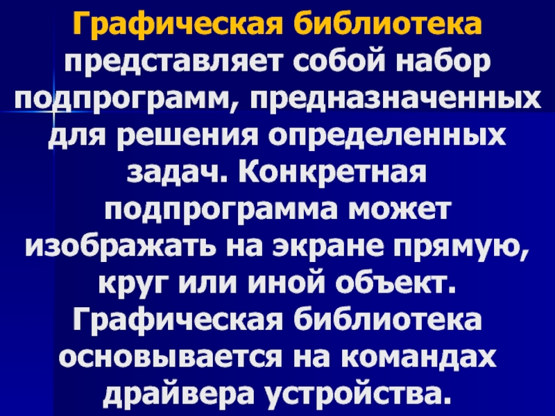 Конкретная подпрограмма может изображать на экране прямую, круг или иной объект. Графическая библиотека основывается на командах драйвера устройства.