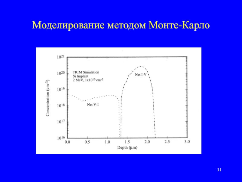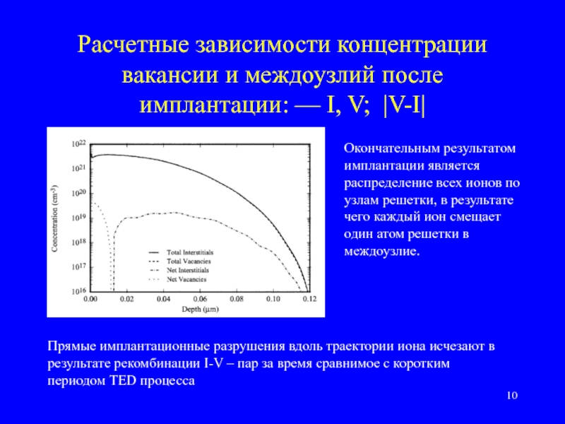 Слайд 10Расчетные зависимости концентрации вакансии и междоузлий после имплантации: — I, V;