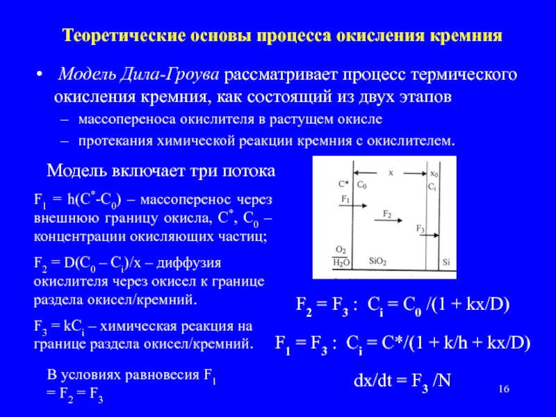 F2 = D(C0 – Ci)/x – диффузия окислителя через окисел к границе раздела окисел/кремний.