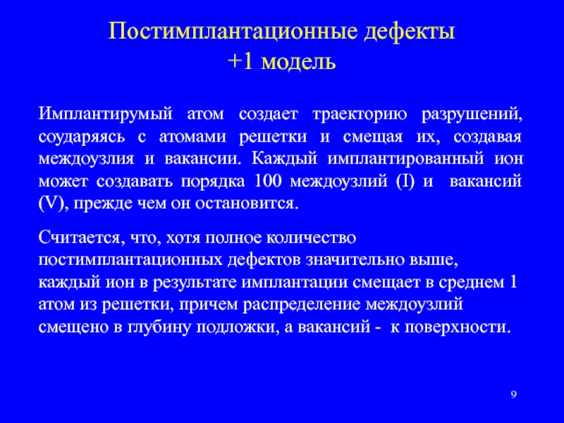 Считается, что, хотя полное количество постимплантационных дефектов значительно выше, каждый ион в результате имплантации смещает в среднем 1 атом из решетки, причем распределение междоузлий смещено в глубину подложки, а вакансий - к поверхности.