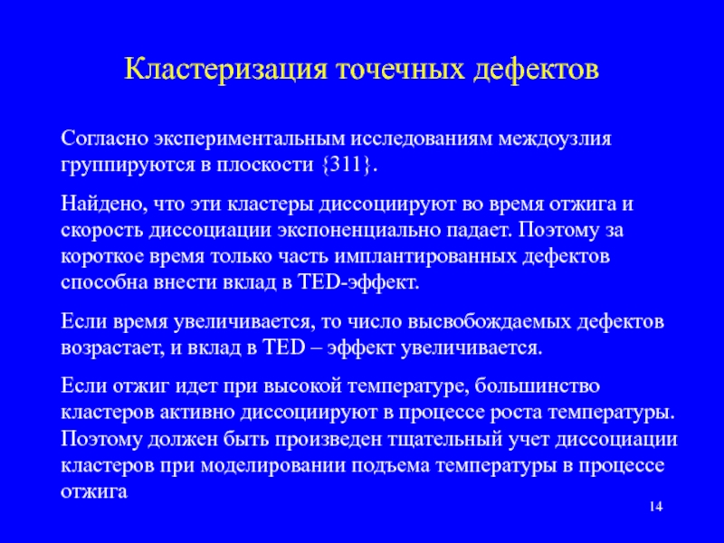 Найдено, что эти кластеры диссоциируют во время отжига и скорость диссоциации экспоненциально падает. Поэтому за короткое время только часть имплантированных дефектов способна внести вклад в TED-эффект.