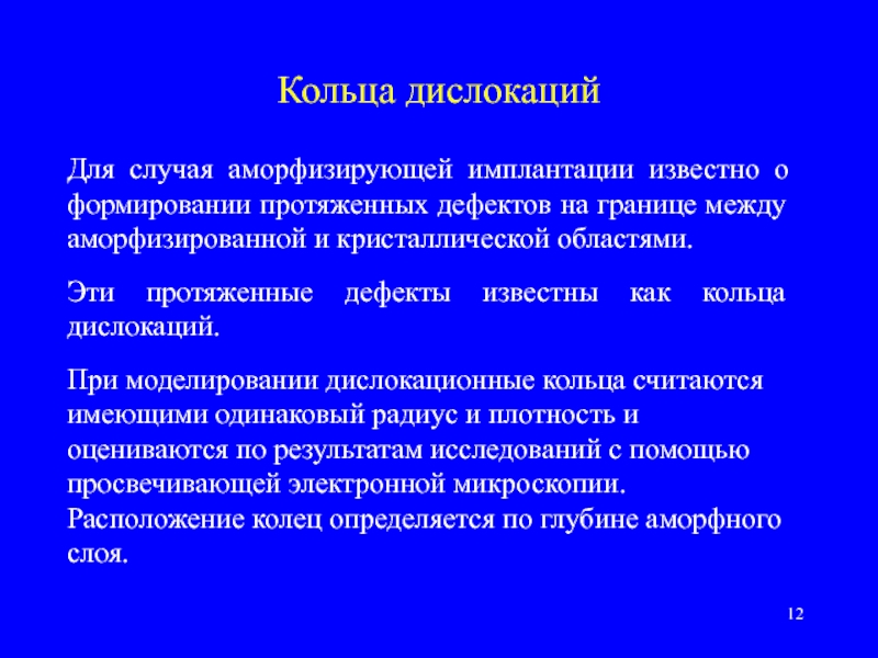 При моделировании дислокационные кольца считаются имеющими одинаковый радиус и плотность и оцениваются по результатам исследований с помощью просвечивающей электронной микроскопии. Расположение колец определяется по глубине аморфного слоя.