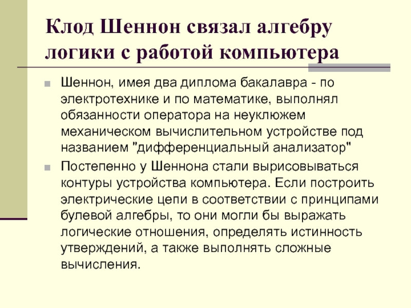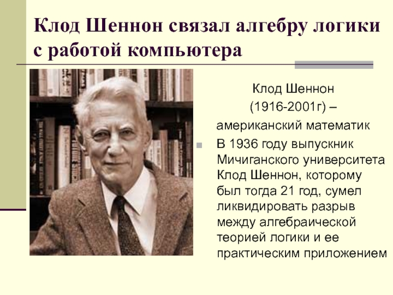 Слайд 13Клод Шеннон связал алгебру логики с работой компьютера