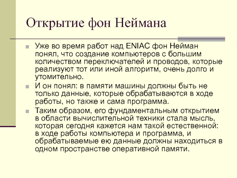 Таким образом, его фундаментальным открытием в области вычислительной техники стала мысль, которая сегодня кажется нам такой естественной: в ходе работы компьютера и программа, и обрабатываемые ею данные должны находиться в одном пространстве оперативной памяти.