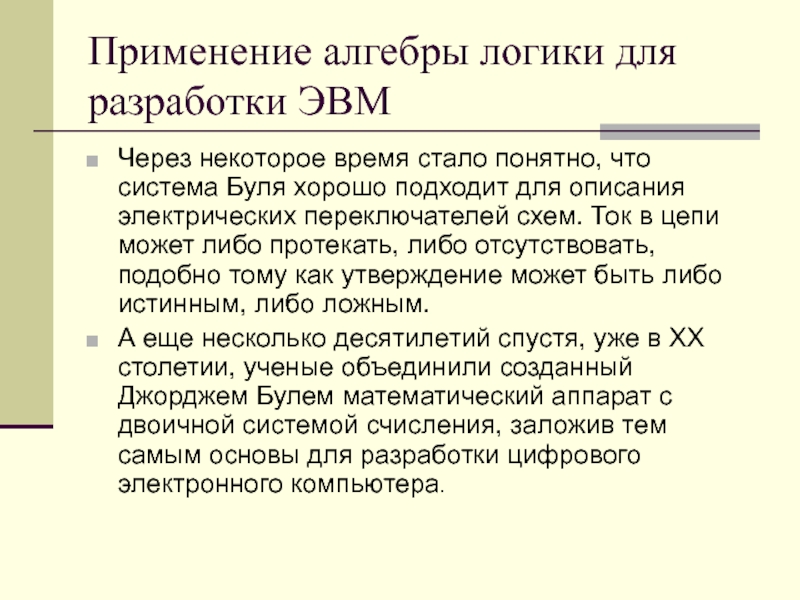 Слайд 10Применение алгебры логики для разработки ЭВМ