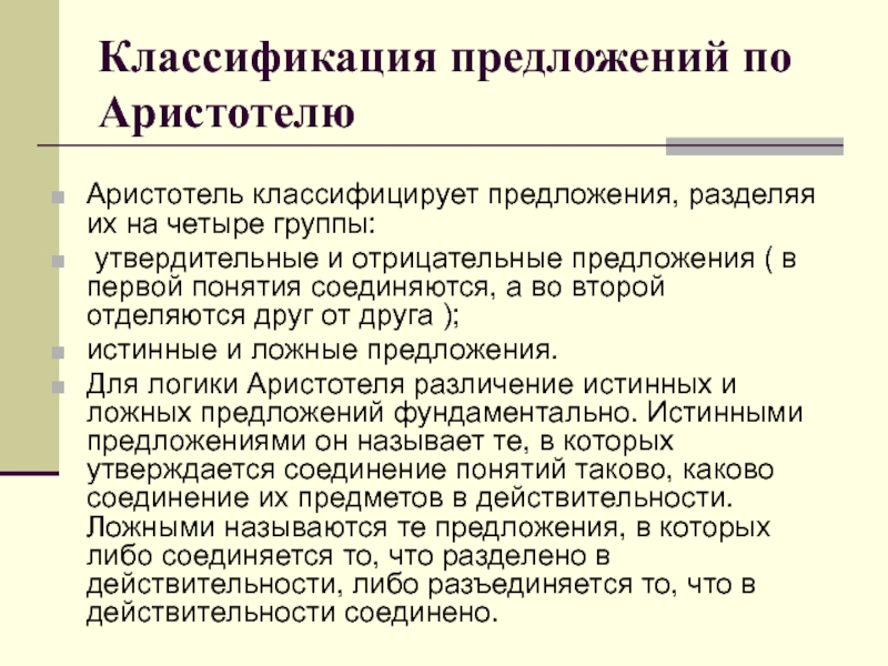 Для логики Аристотеля различение истинных и ложных предложений фундаментально. Истинными предложениями он называет те, в которых утверждается соединение понятий таково, каково соединение их предметов в действительности. Ложными называются те предложения, в которых либо соединяется то, что разделено в действительности, либо разъединяется то, что в действительности соединено.