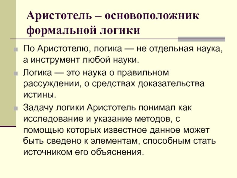 Задачу логики Аристотель понимал как исследование и указание методов, с помощью которых известное данное может быть сведено к элементам, способным стать источником его объяснения.
