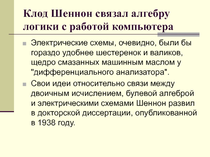 Свои идеи относительно связи между двоичным исчислением, булевой алгеброй и электрическими схемами Шеннон развил в докторской диссертации, опубликованной в 1938 году.