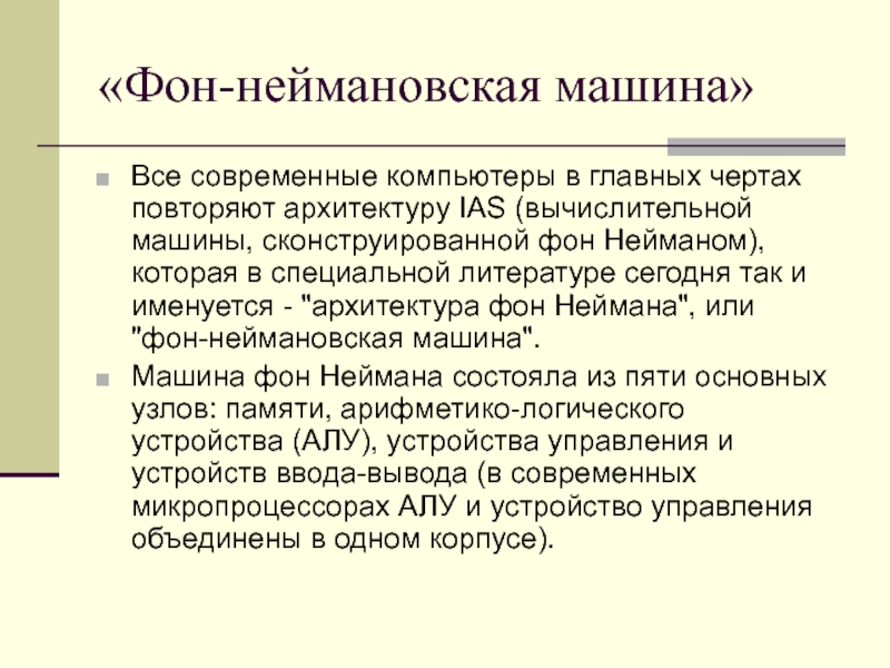 машины, сконструированной фон Нейманом), которая в специальной литературе сегодня так и именуется - "архитектура фон Неймана", или "фон-неймановская машина".