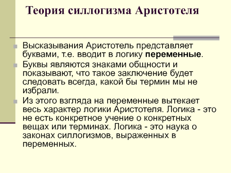 Из этого взгляда на переменные вытекает весь характер логики Аристотеля. Логика - это не есть конкретное учение о конкретных вещах или терминах. Логика - это наука о законах силлогизмов, выраженных в переменных.