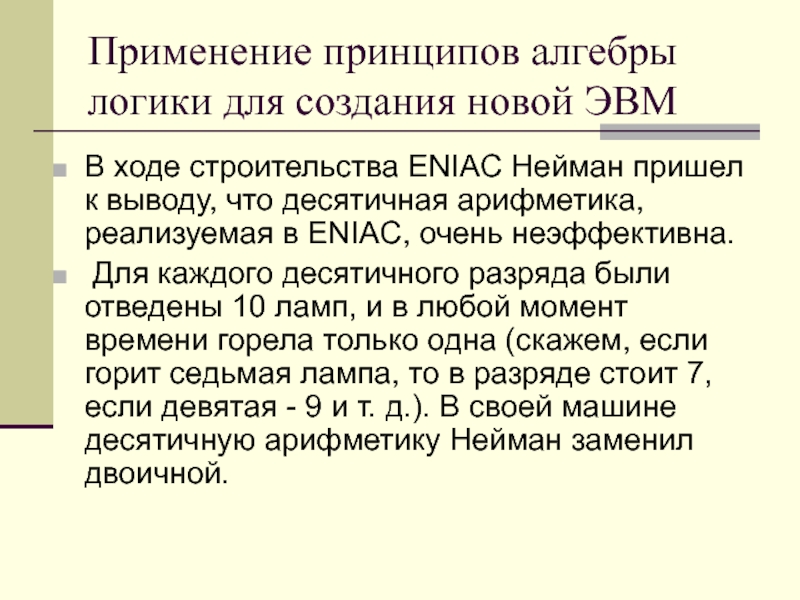 Нейман пришел к выводу, что десятичная арифметика, реализуемая в ENIAC, очень неэффективна.