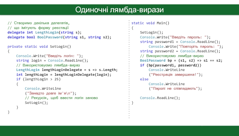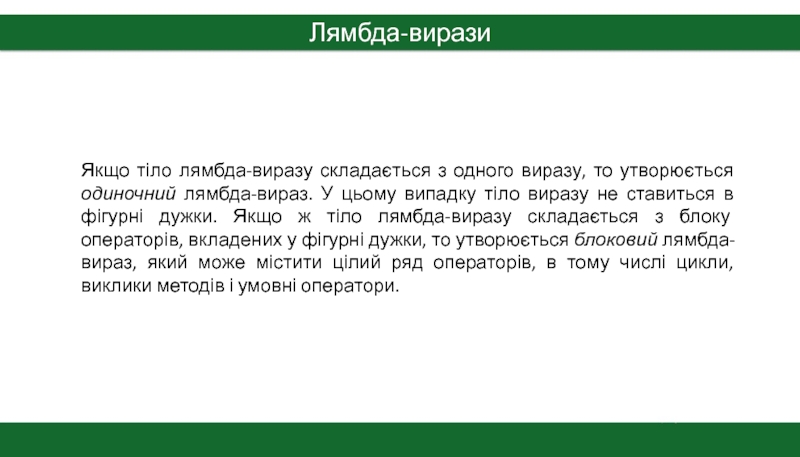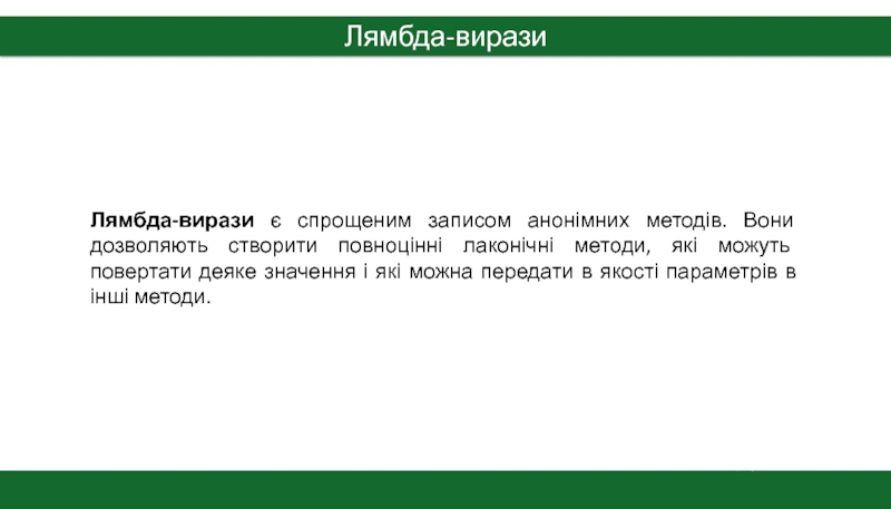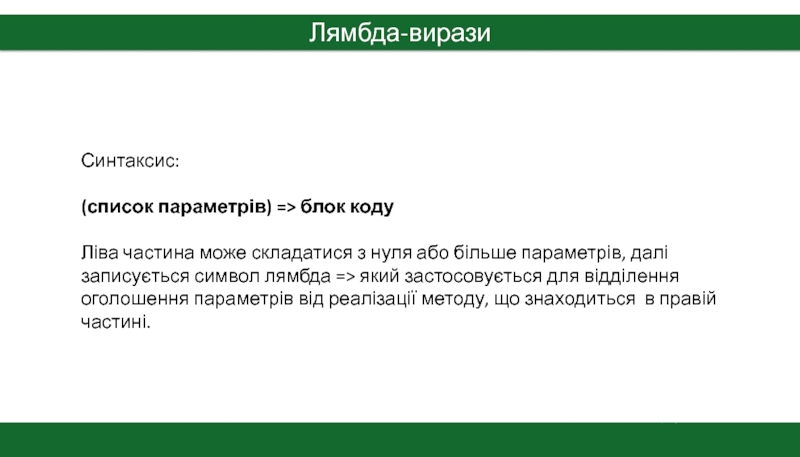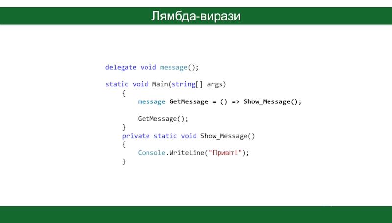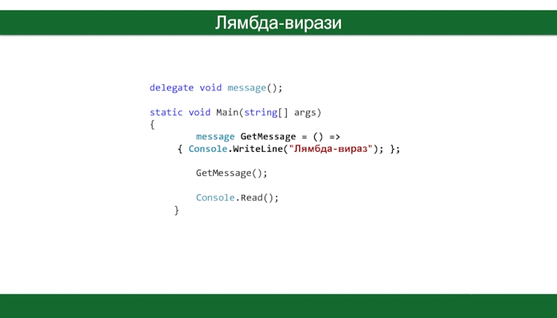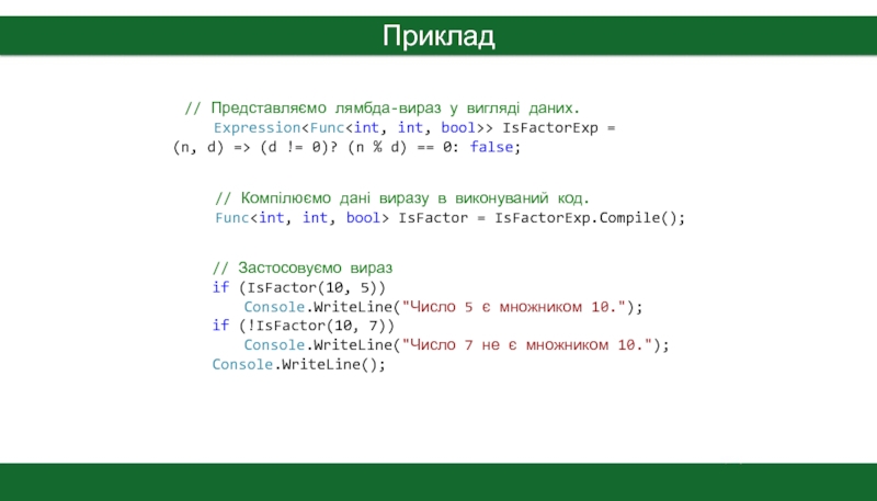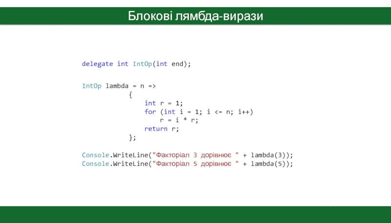 Console.WriteLine("Факторіал 3 дорівнює " + lambda(3));