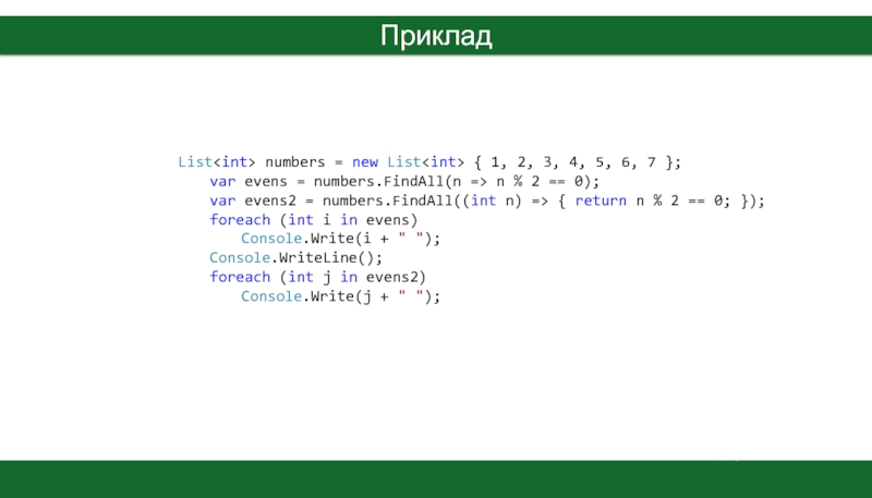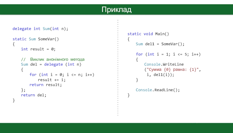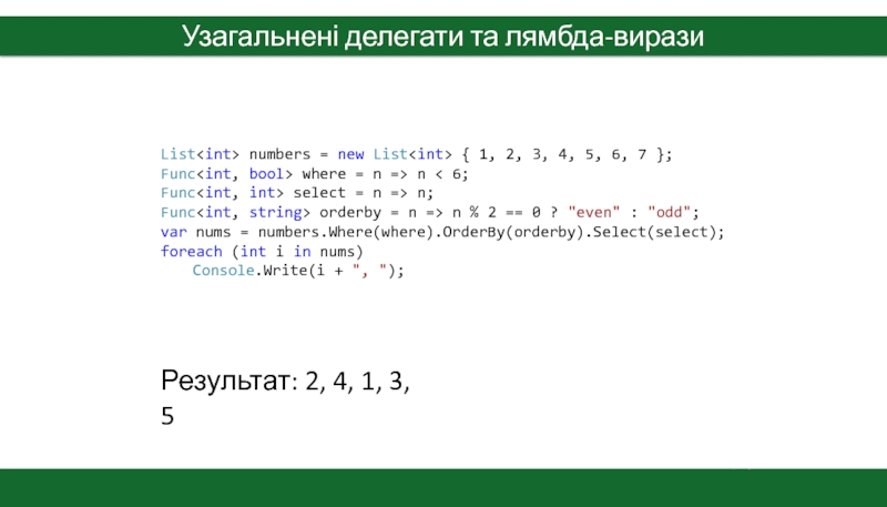Console.WriteLine("Факторіал 5 дорівнює " + lambda(5));