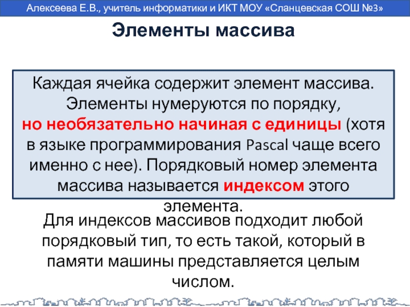 Массивы языка Паскаль характеризуются двумя параметрами:
