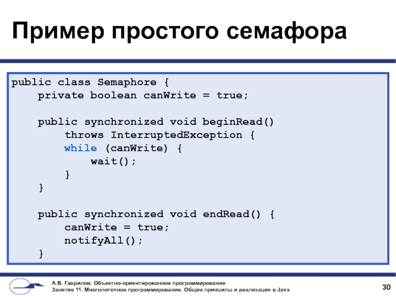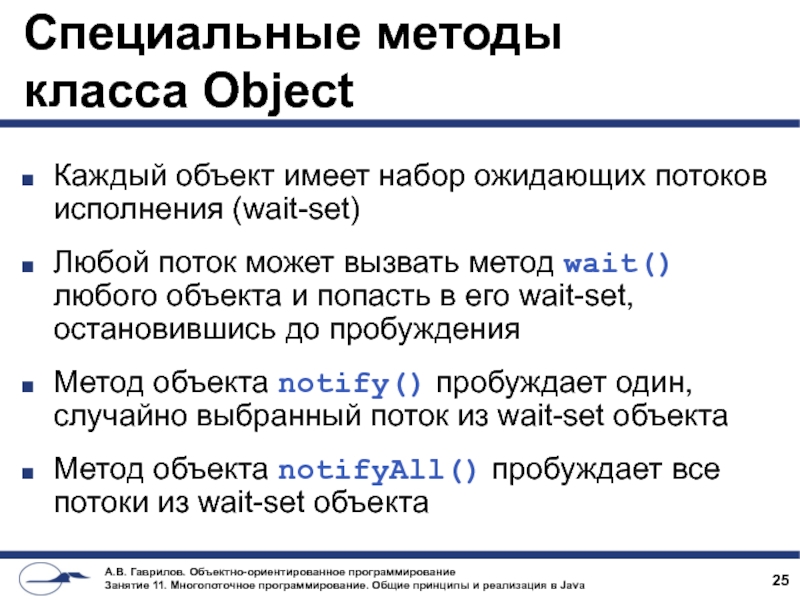 Каждый объект имеет набор ожидающих потоков исполнения (wait-set)