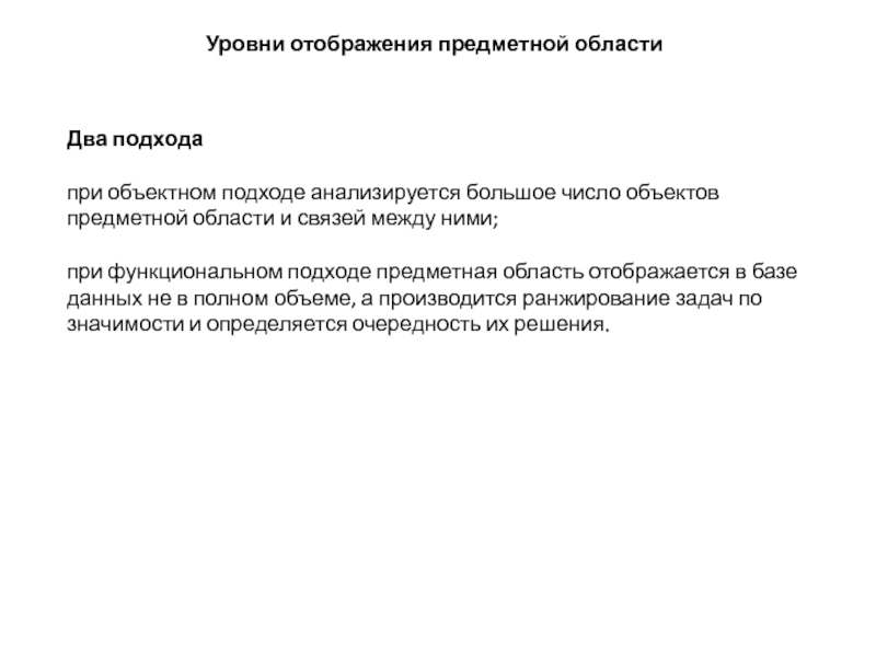 при функциональном подходе предметная область отображается в базе данных не в полном объеме, а производится ранжирование задач по значимости и определяется очередность их решения.