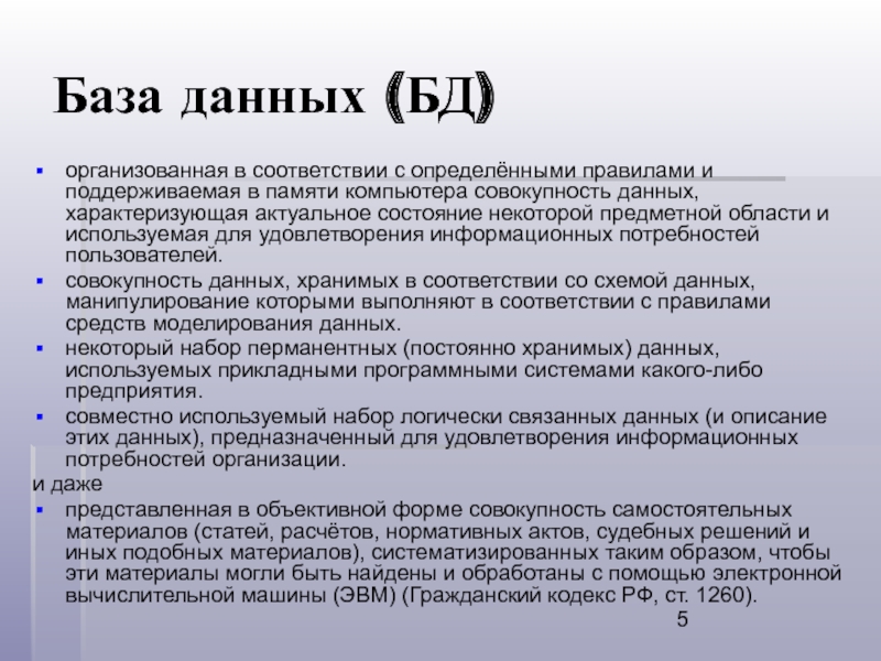 представленная в объективной форме совокупность самостоятельных материалов (статей, расчётов, нормативных актов, судебных решений и иных подобных материалов), систематизированных таким образом, чтобы эти материалы могли быть найдены и обработаны с помощью электронной вычислительной машины (ЭВМ) (Гражданский кодекс РФ, ст. 1260).