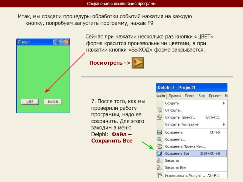 7. После того, как мы проверили работу программы, надо ее сохранить. Для этого заходим в меню Delphi: Файл – Сохранить Все