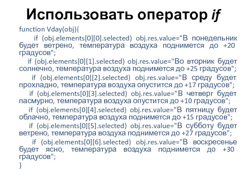if (obj.elements[0][1].selected) obj.res.value="Во вторник будет солнечно, температура воздуха поднимется до +25 градусов";