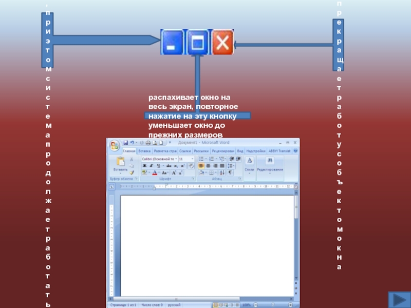 распахивает окно на весь экран, повторное нажатие на эту кнопку уменьшает окно до прежних размеров