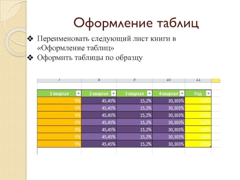Переименовать следующий лист книги в «Оформление таблиц»