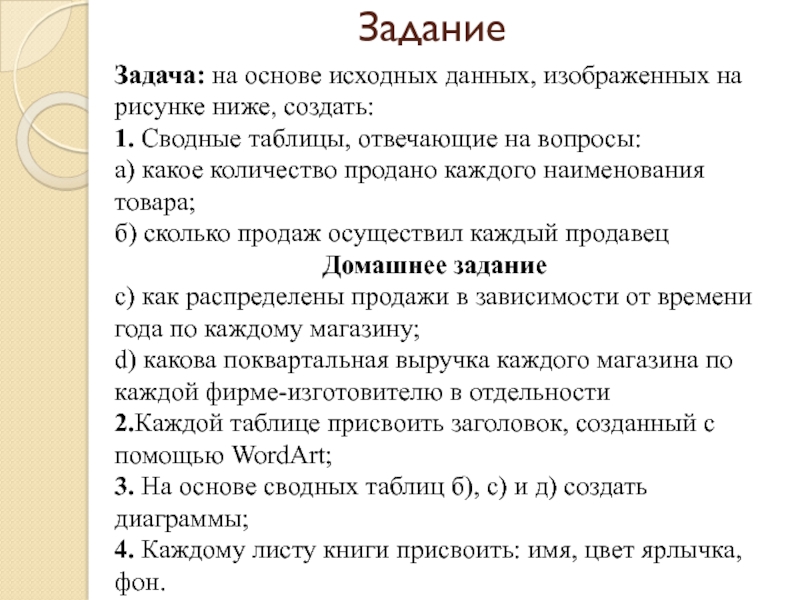 Задача: на основе исходных данных, изображенных на рисунке ниже, создать: