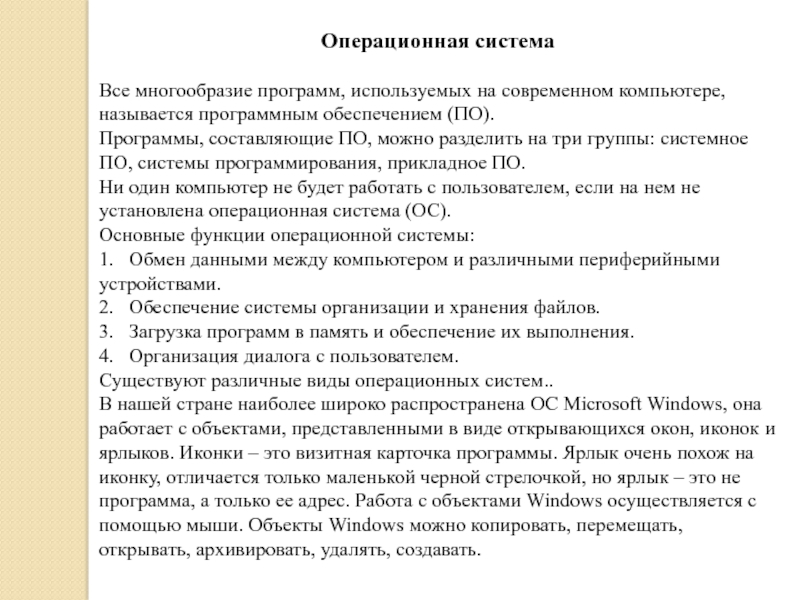 В нашей стране наиболее широко распространена ОС Microsoft Windows, она работает с объектами, представленными в виде открывающихся окон, иконок и ярлыков. Иконки – это визитная карточка программы. Ярлык очень похож на иконку, отличается только маленькой черной стрелочкой, но ярлык – это не программа, а только ее адрес. Работа с объектами Windows осуществляется с помощью мыши. Объекты Windows можно копировать, перемещать, открывать, архивировать, удалять, создавать.